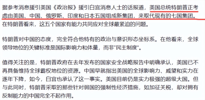 近日,据美国《政治报》援引白宫消息,美国总统特朗普正考虑推出全新五国新集团。