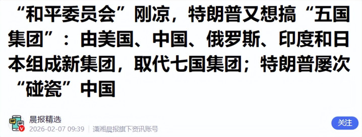 参考信息:晨报精选——2026年2月7日——“和平委员会”刚凉,特朗普又想搞“五国集团”:由美国、中国、俄罗斯、印度和日本组成新集团,取代七国集团;特朗普屡次“碰瓷”中国